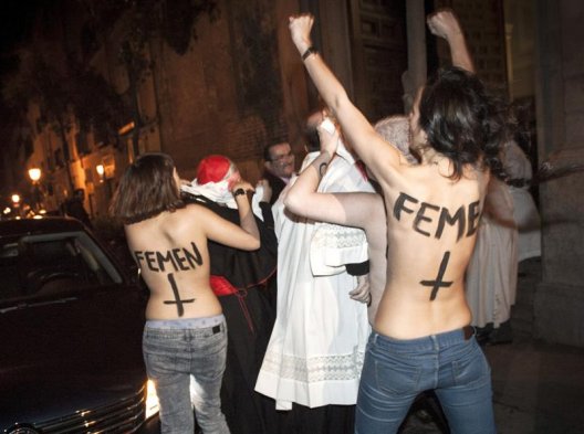 Cinco activistas del movimiento feminista Femen se manifestaron con el torso desnudo a favor del aborto en la parroquia de los Santos Justo y Pastor de Madrid. Las mujeres encararon al arzobispo y cardenal Antonio María Rouco Varela.