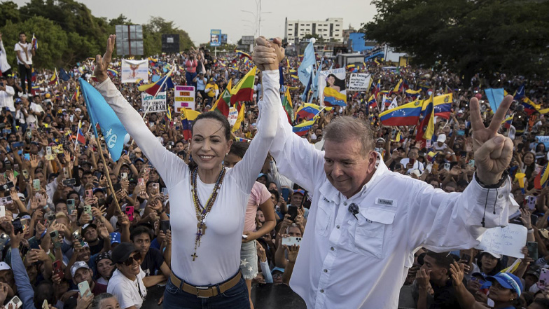 La líder opositora venezolana María Corina Machado y el candidato a la Presidencia Edmundo González saludan a seguidores en un acto de campaña, el pasado 10 de julio en Puerto La Cruz. (Foto:EFE)