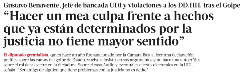 En el acto oficial, el Mandatario lamentó la entrevista condedida por el jefe de la bancada de diputados de la UDI, Gustavo Benavente, quien planteó en La Tercera que la idea de que la derecha haga un "mea culpa" en esta época, "frente a hechos que ya están determinados por la Justicia, no tiene mayor sentido".