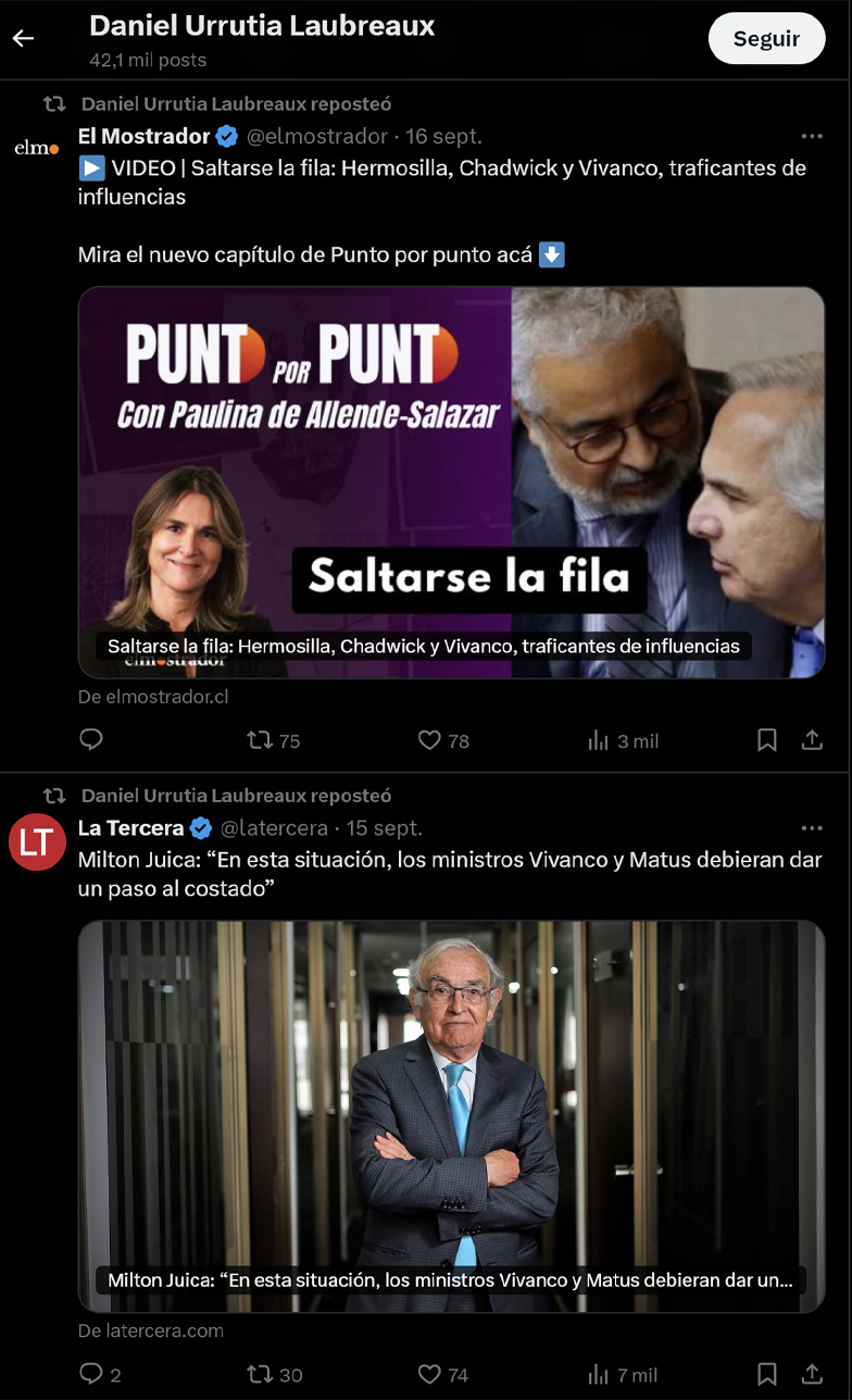 La defensa de Vivanco evalúa requerir la inhabilidad de Urrutia, puesto que éste, que es muy activo en redes sociales, a través de una serie de retuits en X ha deslizado una opinión favorable a la remoción de la ministra, en el marco del proceso disciplinario que desarrolla la Suprema.