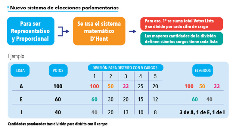 Se trata del sistema D'Hondt, creado por el jurista belga Víctor D'Hondt en 1878, un método matemático para la asignación de escaños que permite obtener el número de cargos electos asignados en cada distrito en proporción a los votos obtenidos por las listas electorales que compiten.