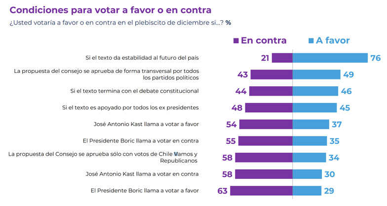 En cuanto a distintos escenarios que condicionarían el voto, el 76% apuntó que apoyaría la propuesta si creyera que da estabilidad a Chile; y el 49% señaló como factor que el texto fuese aprobado transversalmente por todos los partidos políticos; el 46% estaría a favor si con ello se termina el debate constitucional y el 45% si la Carta Fundamental es apoyada por todos los expresidentes.