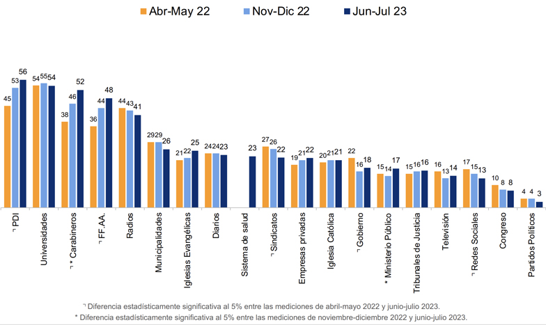 Las instituciones en que menos confía la gente son las redes sociales (13 por ciento), el Congreso Nacional (8 por ciento) y los partidos políticos (3 por ciento), que continúan a la baja.