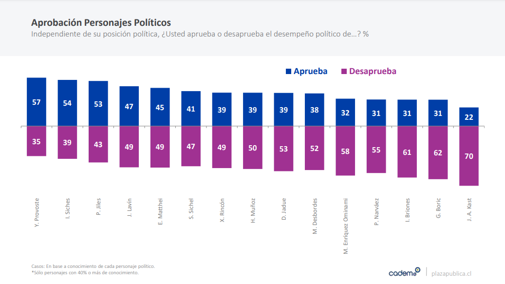 Detrás de Provoste están la líder del Colegio Médico, Izkia Siches (54 por ciento), la diputada humanista Pamela Jiles (53 por ciento), el presidenciable de la UDI Joaquín Lavín (47 por ciento), y la rival de este último en el gremialismo, la alcaldesa reelecta Evelyn Matthei (45 por ciento).