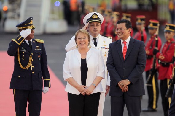 Al aterrizar en El Salvador, donde realiza una breve visita oficial, la Presidenta Michelle Bachelet fue recibida en el aeropuerto Internacional Monseñor Óscar Arnulfo Romero por el canciller Hugo Martínez, la embajadora María Inés Ruz y el alcalde Nayib Bukele, quien le entregó las llaves de la capital y la declaró "huésped distinguida" de San Salvador.