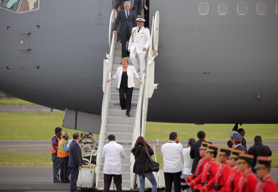 Al aterrizar en El Salvador, donde realiza una breve visita oficial, la Presidenta Michelle Bachelet fue recibida en el aeropuerto Internacional Monseñor Óscar Arnulfo Romero por el canciller Hugo Martínez, la embajadora María Inés Ruz y el alcalde Nayib Bukele, quien le entregó las llaves de la capital y la declaró "huésped distinguida" de San Salvador.