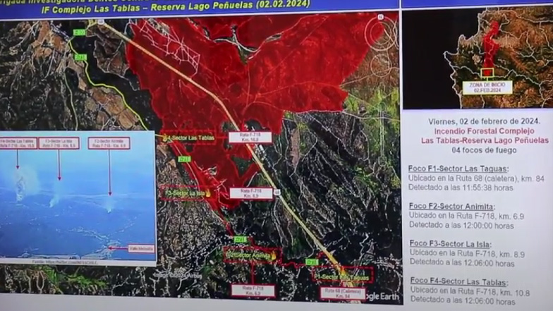 Según la indagatoria, el megaincendio, denominado Complejo Las Tablas-Reserva Lago Peñuelas, tuvo su inicio aquel 2 de febrero en cuatro puntos: en los sectores de Las Taguas -detectado formalmente a las 11:55 horas-, de Animita -a las 12:00-, de La Isla -a las 12:06- y de Las Tablas -a las 12:06-.