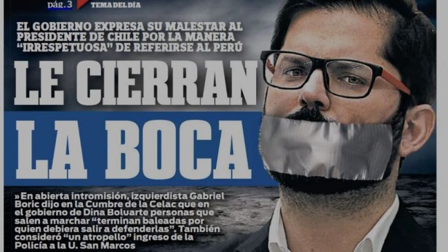 En este marco, el diario El Correo de ese país ha causado polémica con su portada de este jueves: aparece el Presidente Boric con una cinta en su boca junto al titular "le cierran la boca", haciendo alusión a la reacción del gobierno peruano a las declaraciones del Mandatario.