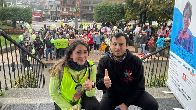 Camila Gómez junto a Marco Reyes, presidente de la Corporación Familias Duchenne Chile, quien la acompaña en la odisea.
