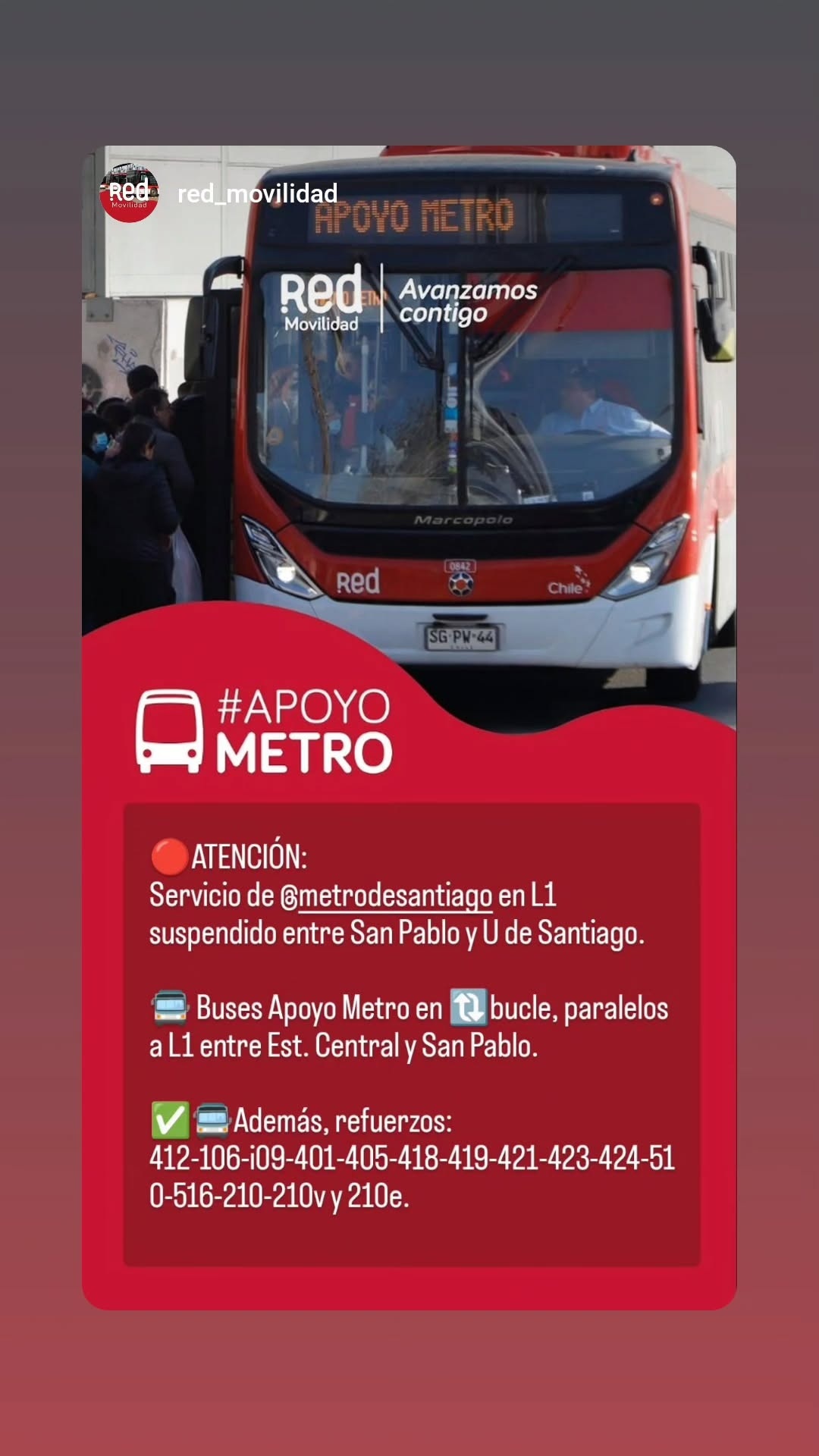 Ante la contingencia, la Red Metropolitana de Movilidad había dispuesto buses de apoyo para el trayecto entre San Pablo y Estación Central, y reforzó los recorridos que suelen circular por la Alameda.