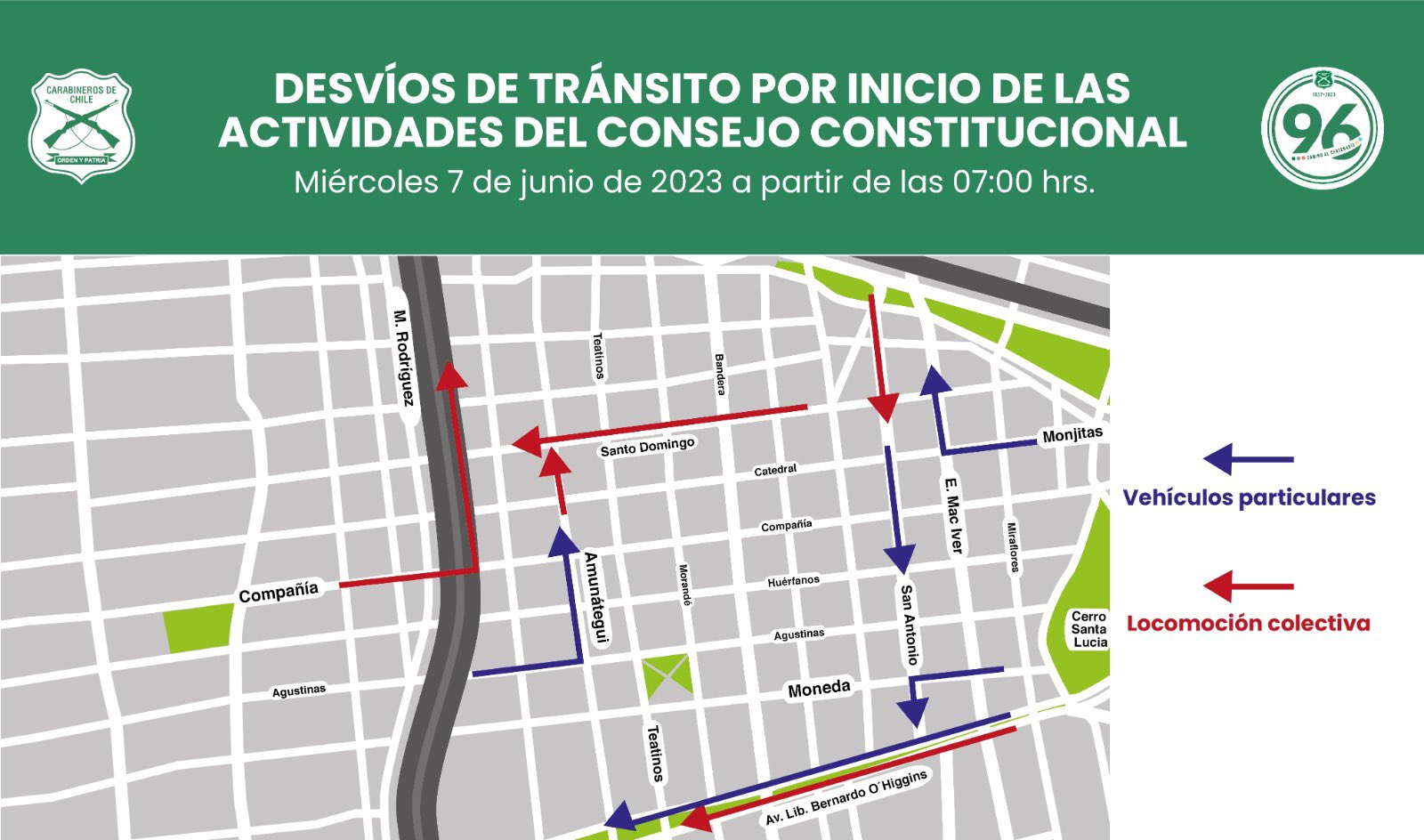La mañana de este miércoles se llevará a cabo la ceremonia de instalación del Consejo Constitucional en la sede del Congreso Nacional en Santiago, por lo que hay cortes y desvíos de tránsito a partir de las 20:00 horas de ayer.