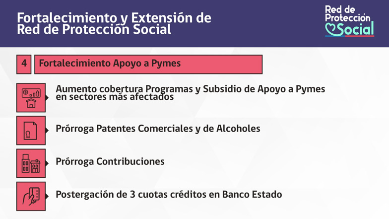 Anticipó, igualmente, que "el Banco Estado anunciará la prórroga por hasta 3 meses y sin intereses del pago de las cuotas de crédito de las pymes que califiquen".